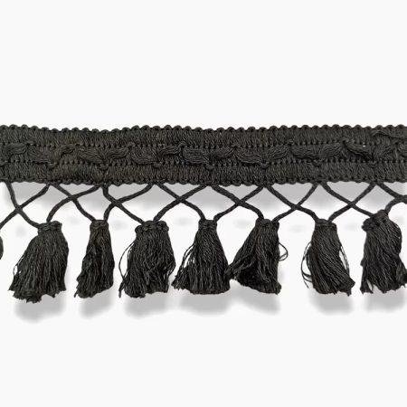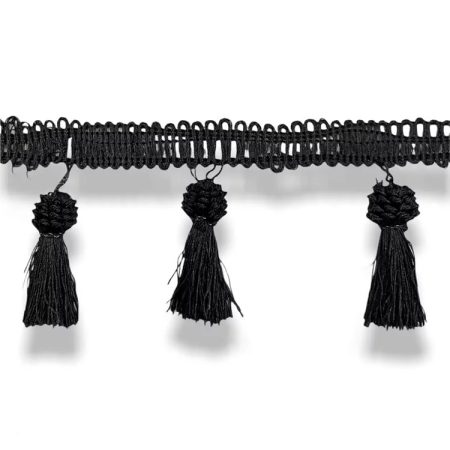 passamaneria con bandina interamente ricamata a macchina, e con conseguenti nappine pendenti, intervallate ogni due centimetri m