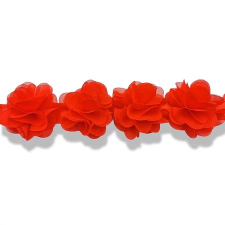 passamaneria composta da file di rose, realizzate con tessuto di chiffon rosso mm 50