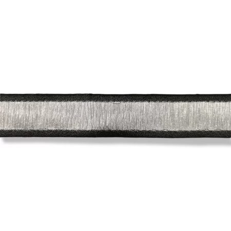 passamaneria bordata ai lati e realizzata centralmente da fili lurex argento posti in verticale mm 25