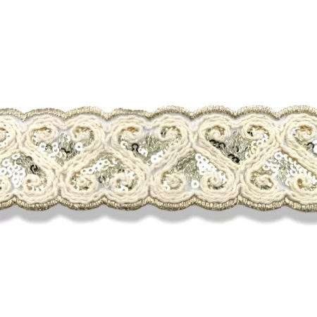 passamaneria bordata ai lati e con paillettes rettangolari interamente ricamate a macchina su tessuto di tulle mm 25