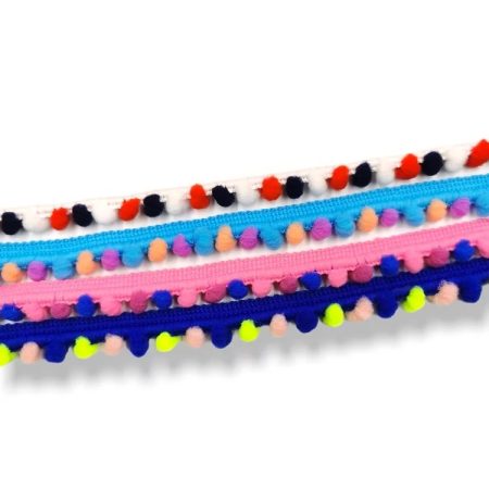 passamaneria con pompon colorati intervallati ogni centrimetro h: 15 mm , di cui la bandina 10 mm e pompon da 5 mm
