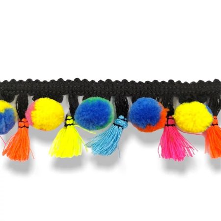 passamaneria con pendenti e nappine colorate e pompon multicolor ad intervalli di 3 cm h: 45 mm, di cui la bandina 10 mm e pende