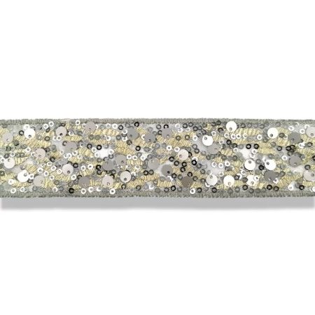 passamaneria con ricamo centrale, e con paillettes silver lucide che formano delle stelle e paillettes grandi pendenti, su base