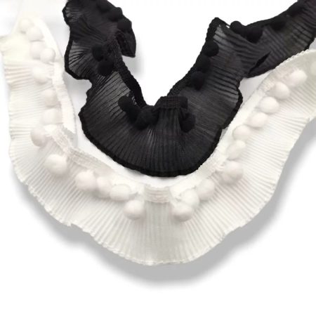 passamaneria con ricami bianchi e neri, tessuto di organza plissettato a doppio strato, con bordini cm 11