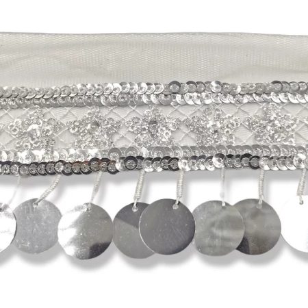passamaneria con ricami centrali in filo lurex argento e paillettes tonde, h totale 10 cm, bandina centrale da 5,5 cm , pendenti