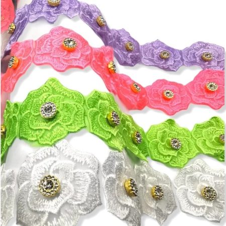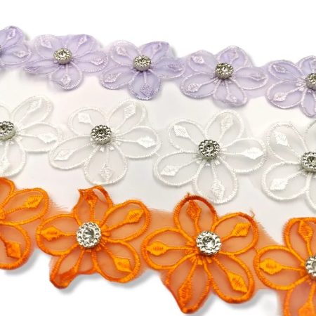 passamaneria in tessuto di organza, con dei fiori ricamati disposti in serie, il pistillo È un inserto con pietre strass crystal