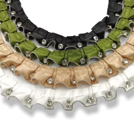 passamaneria plissettata in raso con pietre crystal applicate e file di microsfere che ne delineano il bordo inferiore mm 20