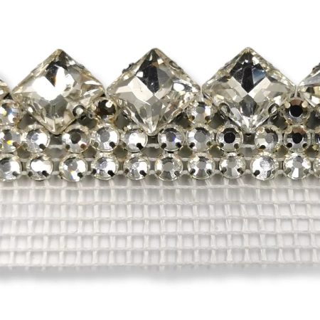 passamaneria realizzata su base di rete bianca con catena elettrosaldata al cui interno vi sono castonate pietre crystal mm 40