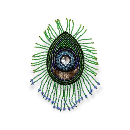 applicazione a forma di lettera s, ricamata interamente a macchina, con inserti in corallini e pietre, con nappina verde e perli