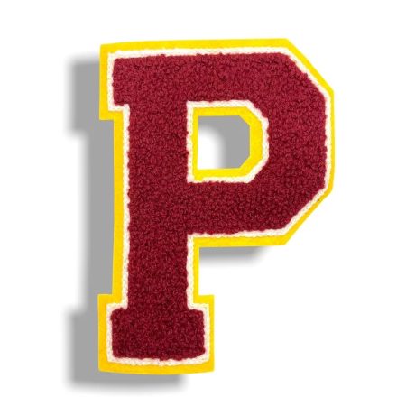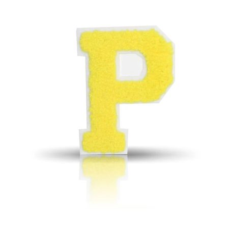 patch ricamata e termoadesiva in punto spugna, raffigurante la lettera p gialla su fondo bianco 7,3 cm x 9,5 cm