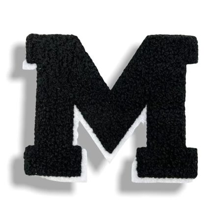 patch ricamata e termoadesiva in punto spugna di colore nero raffigurante la lettera m su fondo bianco 10,5 cm x 8,8 cm