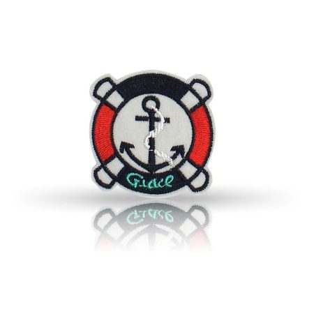 patch termoadesiva di forma circolare e interamante ricamata a macchina, in tema marinaro, raffigurante un ancora e un salvagent