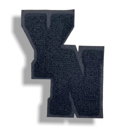 patch termoadesiva base in panno lenci raffigurante la scritta ”yn”, ricamata interamente a macchina in punto spugna 11 cm x 8