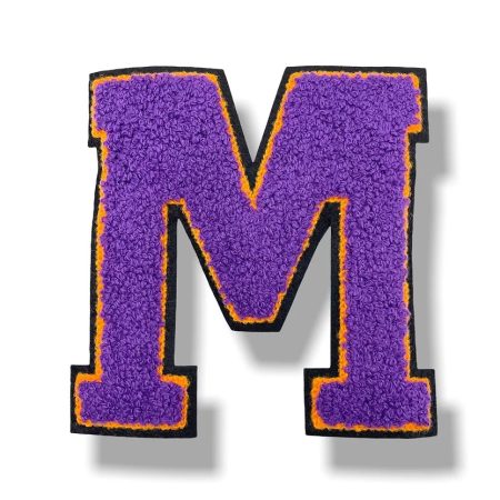 patch termoadesiva base in panno lenci raffigurante la lettera ”m”, ricamata interamente a macchina in punto spugna 13 cm x 13