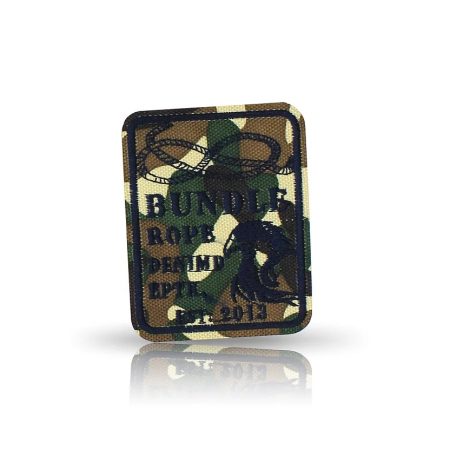 patch termoadesiva di forma rettangolare a tema militare su fondo di tessuto camouflage, con ricamo raffigurante uno stemma 6,4
