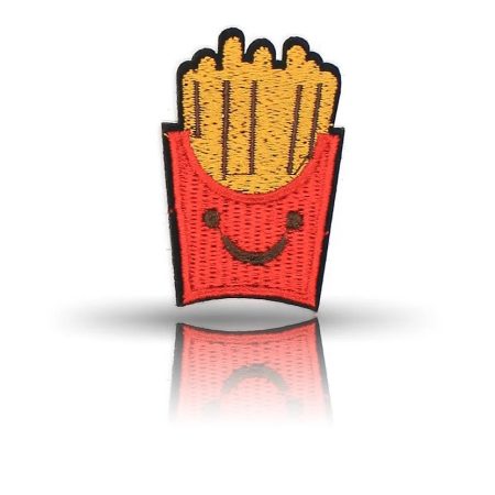 patch termoadesiva con ricamo nero a contrasto, motivo sacchetto con patatine fritte di colore giallo 3,7 cm x 5,6 cm