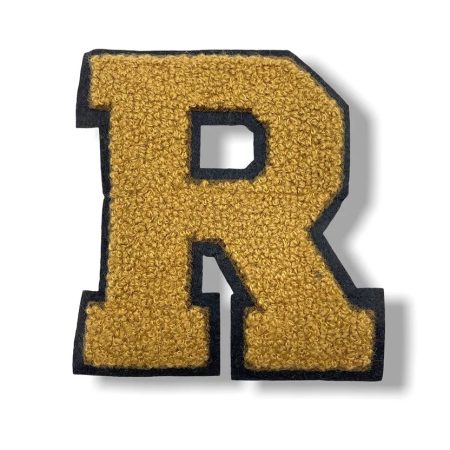 patch termoadesiva base in panno lenci raffigurante la lettera ”r”, ricamata interamente a macchina in punto spugna 11 cm x 10