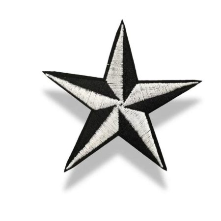 patch termoadesiva e interamente ricamata a macchina, raffigurante una stella a cinque punte con lati sfaccettati di colore nero