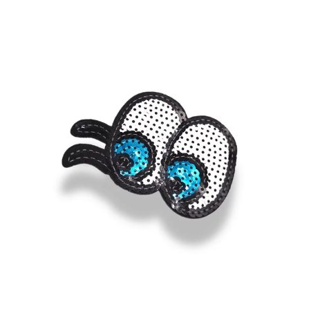 patch termoadesiva e ricamata a forma di occhi , con fondo nero e paillettes bianche a contrasto e con pupille di paillettes cel