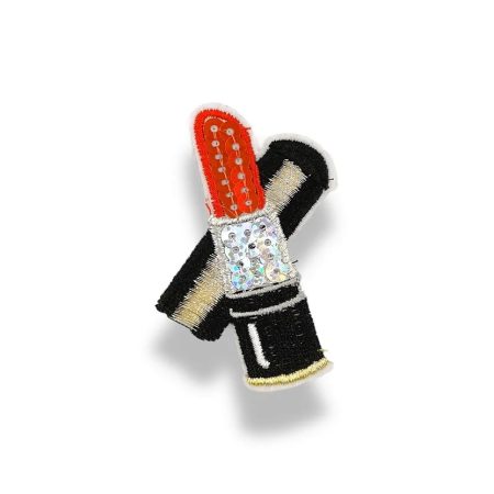 patch termoadesiva e ricamata, raffigurante un rossetto di color rosso, realizzato con paillettes lucide e ricamo in filo lurex