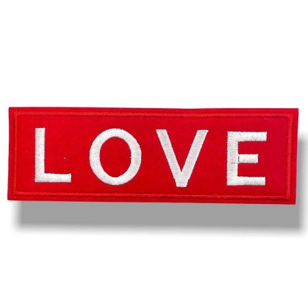 patch termoadesiva scritta “love” ricamata interamente a macchina su base panno lenci rosso 15 cm x 5 cm