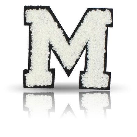 patch termoadesiva ricamata in punto spugna di colore bianco raffigurante la lettera “m” su fondo nero 8,4 cm x 7,7 cm