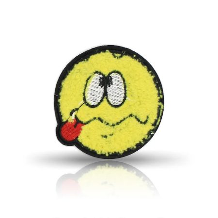 patch termoadesiva smile di colore giallo con ricamo a contrasto nero e lingua rossa 7,6 cm x 7,2 cm