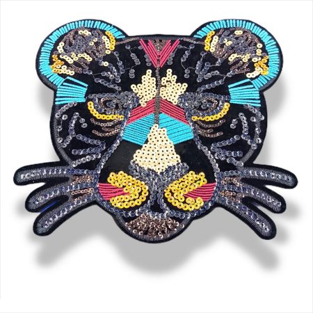 applicazione termoadesiva raffigurante il volto di una pantera, patchgrande realizzata con paillettes ricamate su tessuto in v