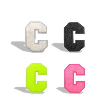 applicazione termoadesiva raffigurante la lettera ” c ” , ricamata interamente a macchina in punto spugna su base di panno lenci