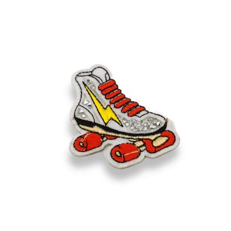 applicazione termoadesiva raffigurante dei pattini a rotelle, ricamata a macchina e con inserti di strass mash 6,5 cm x 5,5 cm