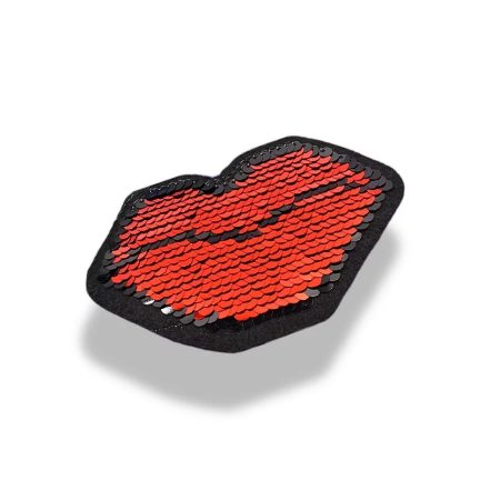 applicazione termoadesiva raffigurante delle labbra, realizzata con paillettes reversibili, interamente ricamate a macchina 7 cm