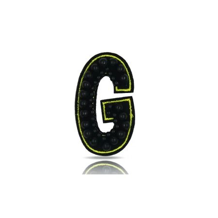 applicazione termoadesiva interamente composta da perle nere cucite a mano e ricamata con filo lurex a forma di lettera g 6 cm x