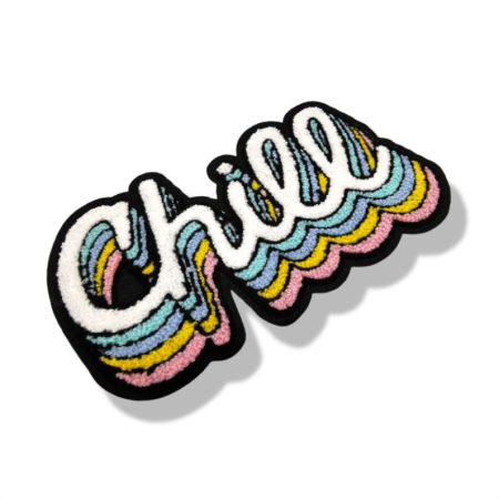 applicazione termoadesiva raffigurante la scritta ” chill “, patch grande interamente realizzata con ricamo in punto spugna, su