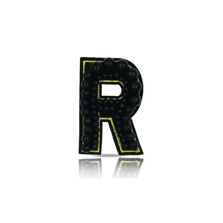 applicazione termoadesiva interamente composta da perle nere cucite a mano e ricamata con filo lurex a forma di lettera r 6 cm x