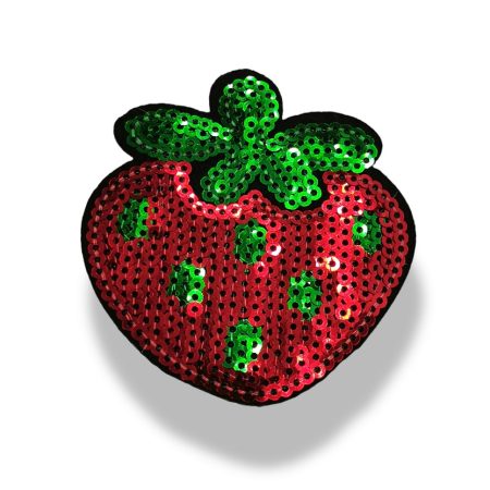 applicazione termoadesiva raffigurante una fragola, realizzata interamente con paillettes 6,7 cm x 6,7 cm