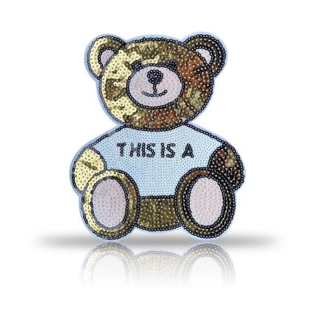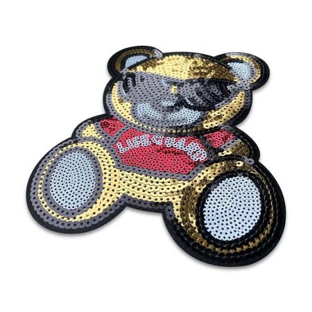 applicazione termoadesiva raffigurante un orsetto seduto, patchgrande realizzata con paillettes interamente ricamate a macchina