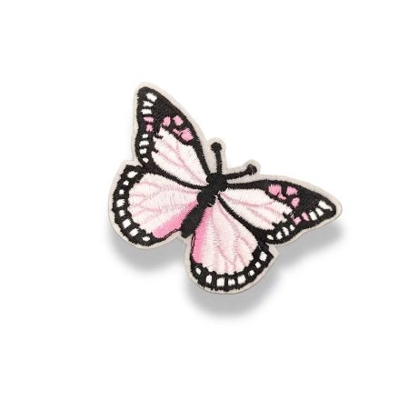 applicazione termoadesiva raffigurante una farfalla, interamente ricamata a macchina con filo nero e nuance di rosa 5 cm x 8 cm
