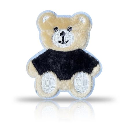 applicazione termoadesiva raffigurante un orsetto seduto , patchgrande realizzata in pelliccia e paillettes ricamate , che ne ev