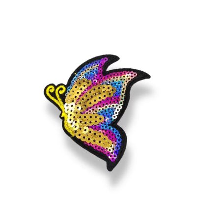 applicazione termoadesiva raffigurante una farfalla di profilo, l’ala È realizzata con paillettes dai colori vivaci ricamate int