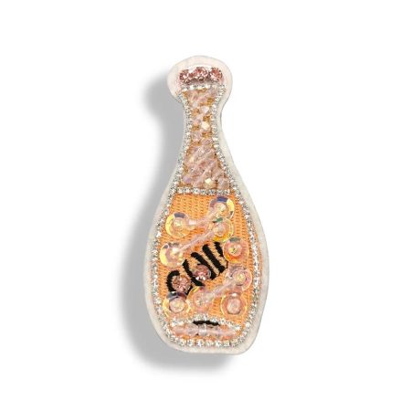 applicazione termoadesiva raffigurante una bottiglia, realizzata con pietre, corallini e paillettes ricamate a macchina e una fi
