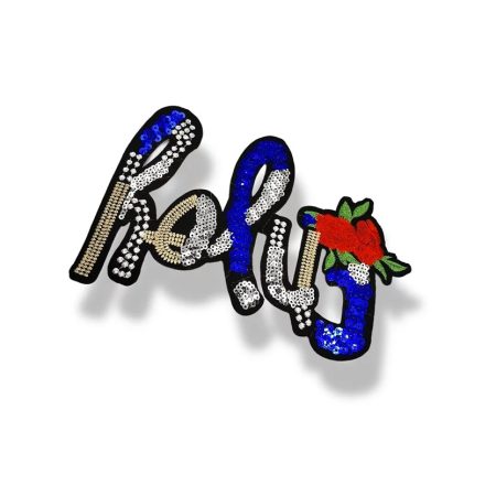 applicazione termoadesiva ricamata interamente a macchina, la scritta È realizzata con file di paillettes ricamate e il fiore È