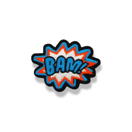 applicazione termoadesiva, ricamata interamente a macchina, con la scritta bam in evidenza 53 mm x 70 mm