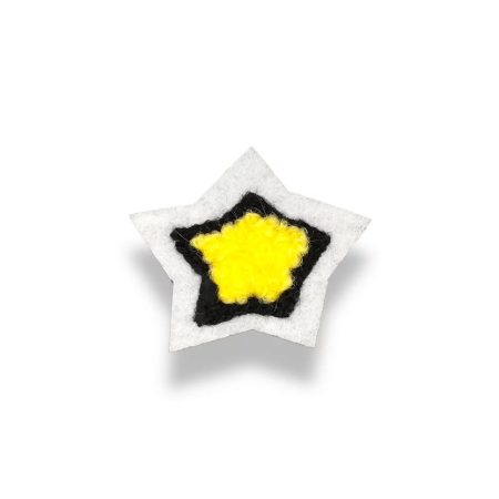 applicazione termoadesiva raffigurante una stella, realizzata su base panno lenci bianca, con stelle sovrapposte nera e gialla i