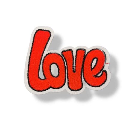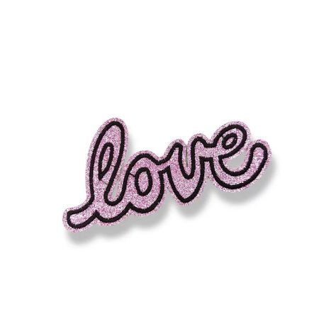applicazione termoadesiva, la scritta ” love ” È realizzata con ricamo a rilievo di color nero su base glitter fucsia 6 cm x 12