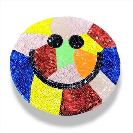 applicazione termoadesiva raffigurante uno smile, patchgrande realizzata con paillettes ricamate interamente a macchina 23,5 cm