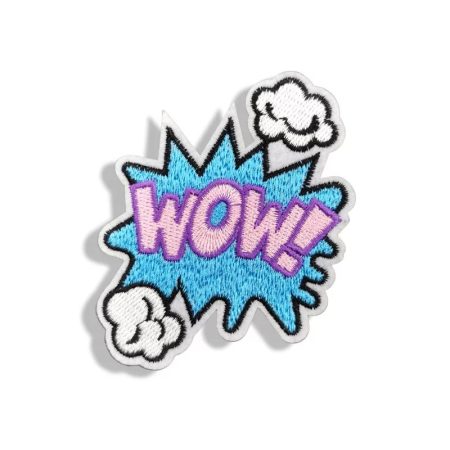 applicazione termoadesiva, ricamata interamente a macchina, con la scritta wow in evidenza 53 mm x 70 mm