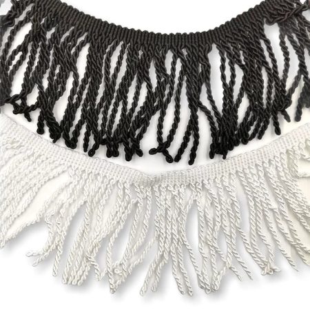 passamaneria in tinta unita, realizzata con bandina superiore ricamata e frange attorcigliate pendenti mm 85