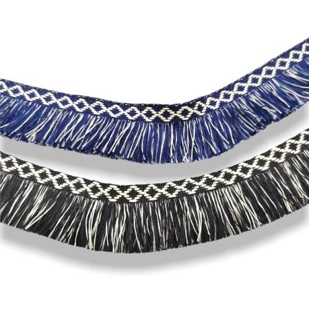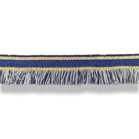 passamaneria realizzata con una bandina ricamata a due colori e frange pendenti mm 35