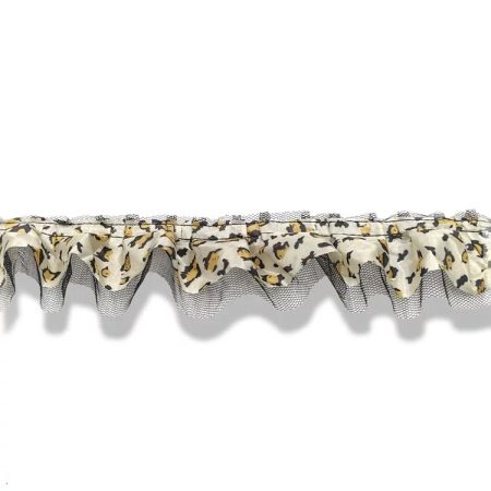 passamaneria realizzata con una bandita di tessuto leopardato sovrapposta ad un tulle nero mm 50