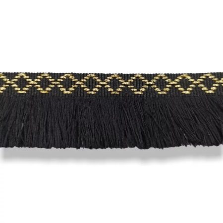 passamaneria realizzata con una bandina ricamata avente inserti in lurex oro e frange nere pendenti mm 35